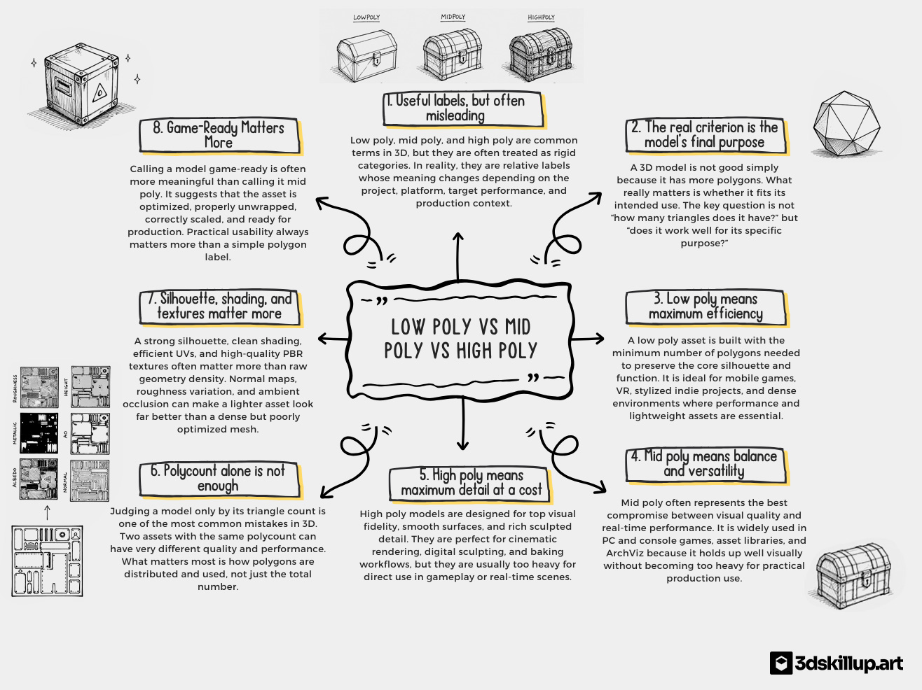 The true meaning of these categories fluctuates wildly based on context. Factors like the target platform, camera distance, scene density, and texture workflow completely change the rules. In short, a fixed polycount number is meaningless unless it is tied to the specific needs of the project.